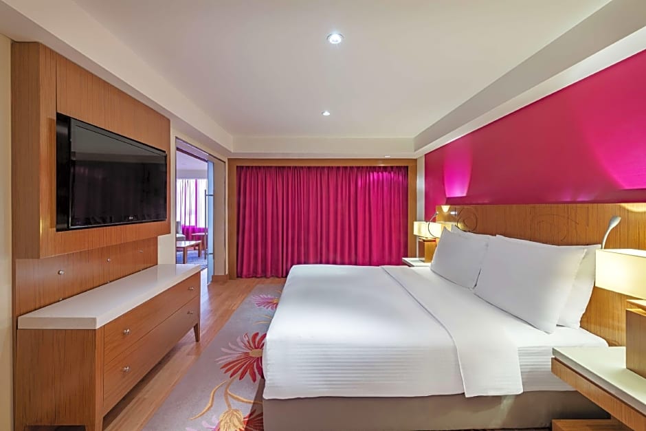This suite comes with a spacious working and sitting area with LED television. This accommodations has a king-size bed in a separate bedroom and an attached bathroom with bathtub, shower and television. It also includes: Bathrobe and slippers Coffee and tea provisions Free high-speed, wireless Internet access Free mini-bar Nespresso® coffee machine 2 pieces of free pressing daily Safety deposit box Weekly and monthly local magazines Work desk with lamp and media hub connections Access to the Business Class Lounge facilities